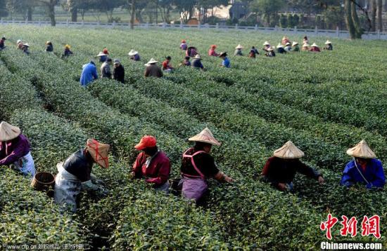 图为杭州梅家坞的茶农和采茶工在采茶。梁臻 摄 图片来源:CFP视觉中国