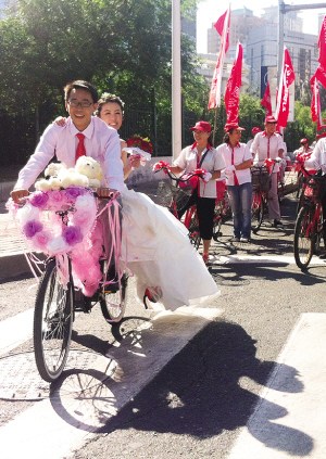 27岁的新郎李聪睿与新娘刘晓毓是大学同学,两人毕业后在同一家单位上班,相恋五年后终于喜结连理。因为职业的关系,平时总是跟自行车打交道,李聪睿就想通过这种方式给新娘一个不一样的婚礼。这种既环保又节省的结婚方式也得到了刘晓毓的赞同。更难能可贵的是,两人的想法也得到了双方老人的大力支持。接亲的车队,多是由他们的同事、朋友组成的。“自行车婚礼不仅不会遇到堵车的烦恼,而且既简单又浪漫,既环保又很有纪念意义。”这位朴素而又美丽的新娘刘晓毓幸福地说。 (首席记者鲁明文/摄)