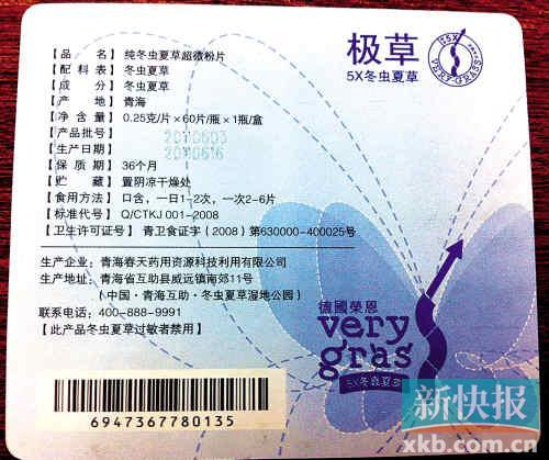 而且,由于目前国内消费者对于合格保健品的鉴别能力并不高,保健品种类又很多,其安全性的辨别非常重要,所以国家规定,凡声称具有保健功能的食品必须经相关部门审查确认、审批,对审查合格的保健品发给《保健品批准证书》;外包装上有国家保健品标志——业内称“淡蓝色牛头标志”(小蓝帽),这是确定一个保健品是否合格安全的最基本条件。而记者在极草5X冬虫夏草系列产品的外包装上,并未看到保健品认证标签,即小蓝帽标志。