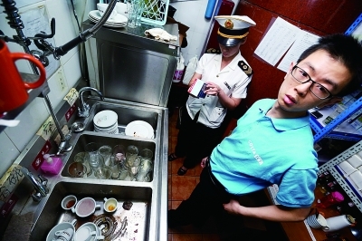 他们的个人用品随意摆放,可能因为操作间面积太小了。五六平方米的地方,既有清洗瓷碗和盘子的池子、高温消毒的机子,又有垃圾桶、货物架、制冰机,还有员工吃饭的桌子、挂衣服放鞋的地方以及员工自己的柜子……