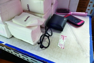 工作人员的钱包、手机等个人物品与餐巾纸放在一起,摄/记者 柴程
