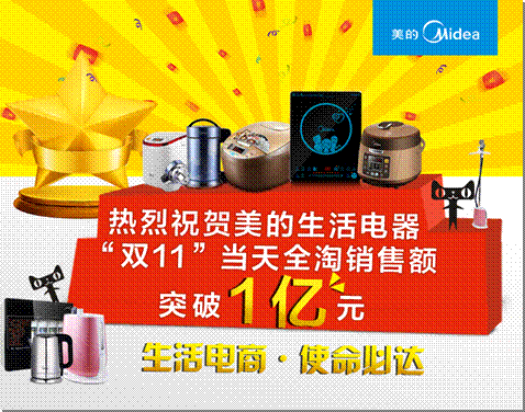 美的生活电器电商负责人表示,“双十一,是美的生活电器大力发展电商的第一次战役,早在2个月前,我们就开始布局,组建团队,策划方案,并于各电商平台进行充分的沟通,我们目标设定就是要突破一个亿,实际销售结果还要好于我们预期,达到1.25个亿。这与2012年度相比,增长了317%。根据天猫给我们的数据,美的生活电器是国内首家,也是唯一在天猫销售破亿的小家电企业。“