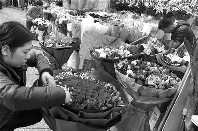 昨天上午10点,在莱太花卉市场鲜花区,大多数商户都在打理着已经包装好的花束,而没有像往年那样急着赶做新的花束。“先把这些卖了再说吧”。