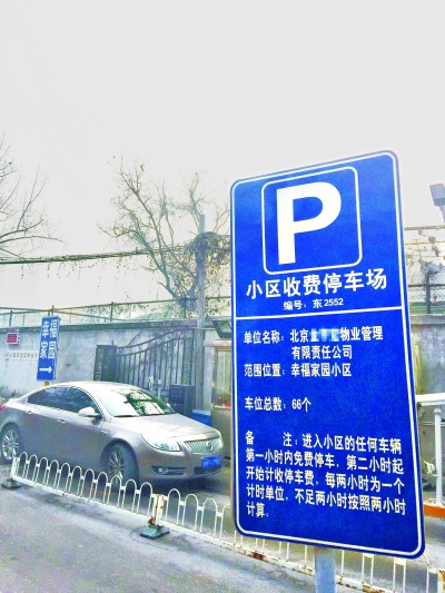 昨天上午,记者在该小区看到,北侧有地上和地下两个停车场,小区的东侧入口立着一个蓝牌,上面按年和按月收费的标示已被划掉。业主靳先生说,地上停车场共有66个车位,由物业负责收费。