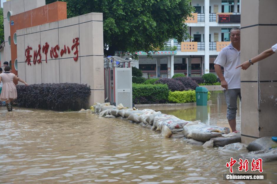 6月2日,福建福安市迎来强降雨,导致该市赛岐镇一街道被雨水淹没,位于该街道的赛岐中心小学受到波及,积水蔓延至学校门口。记者在现场看到,一些沿街商铺人员正拿着扫把在清理积水,小学生或自己穿着雨鞋蹚水上学,或坐着三轮车、或由一些大人背着越过积水上学。叶茂 摄