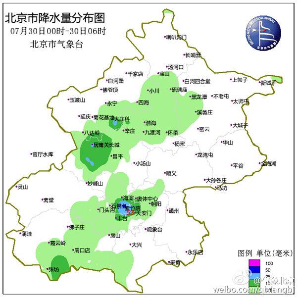 北京7月30日0时-6时降水量分布图(来源:新浪微博@气象北京)