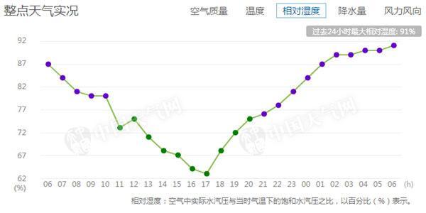 降雨过后,空气湿度大,今天早晨6时的相对湿度为91%,有轻雾,大部地区能见度在2-3公里,请注意行车安全。