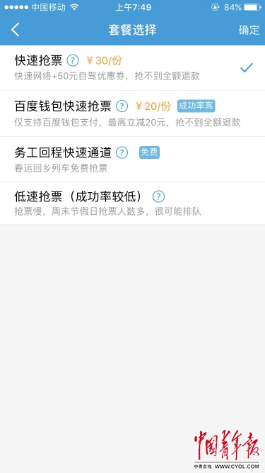 “至尊光速抢票通道:光纤网络,专线专享,极致速度”“VIP极速通道:专享100M带宽,有票闪电秒杀”“VIP高速通道:专享50M带宽,有票闪电秒杀”,在智行火车票客户端上,显示着这3种服务费的类型,收取服务费分别为66元、30元、20元,如果选择不消费,系统的显示则更改为“低速抢票(成功率较低):带宽资源有限,很可能排队,敬请谅解。”