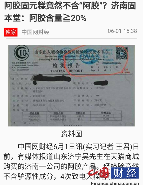 5月底,有媒体报道山东济宁吴先生在天猫商城购买的济南一公司的阿胶产品,经检验不含驴源性成分,4次致电天猫客服未果。吴先生告诉中国网财经记者,自己是在天猫超市购买的济南固本堂生产的阿胶固元糕,购买时天猫超市承诺售后和发票都由天猫超市来负责。因此,与美容院有合作关系的吴先生购入了几万元的阿胶糕,除了供给美容院,吴先生还把这些补品送给亲朋好友,“没想到竟有人会出现腹泻,不得不就近去诊所输液”。