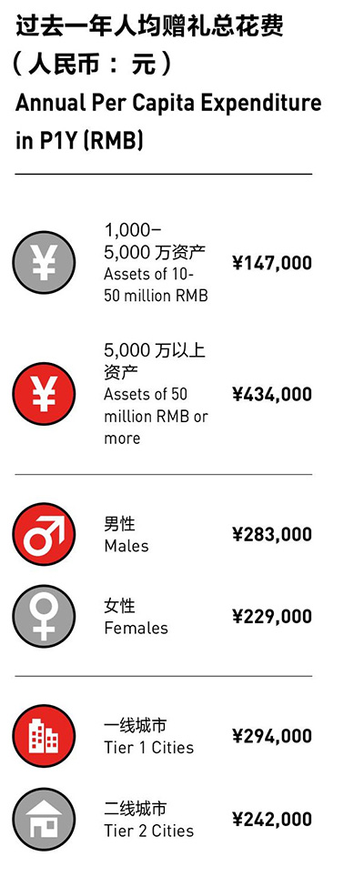 不同人群在过去一年人均赠礼的总花费上差异明显:5,000 万以上资产人群比1,000万-5,000 万资产人群高出近3倍;男性比女性多5.4 万元;一线比二线多5.2 万元。
