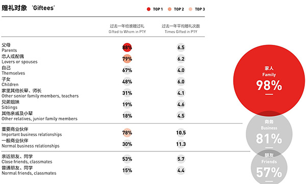 从赠礼对象的类别上看,给“家人” 赠礼的高净值人群比例最高(98%),其次是“商务”(81%),给“朋友”赠礼的相对较少(57%)。具体而言,“父母”、“恋人或配偶”和“重要商业伙伴”是高净值人群最普遍的三类赠礼对象。