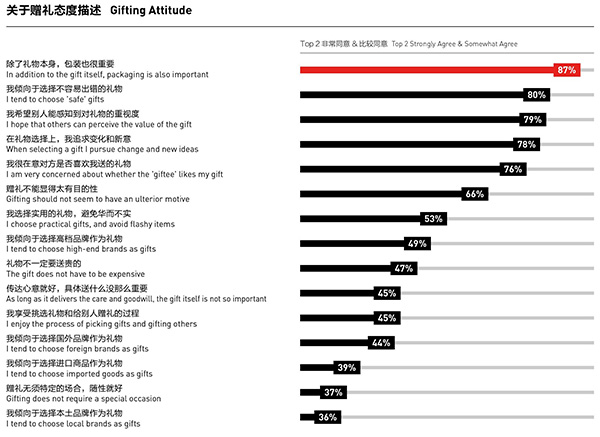 赠礼时,高净值人群会考虑不同的方方面面。价位上,79% 的人“希望别人能感知到对礼物的重视度”,与此同时,66% 的人同意“赠礼不能显得太有目的性”。礼物选择上,80% 的人“倾向于选择不出错的礼品”,但也有78% 的人“追求变化和新意”。此外,87% 的人认可“除了礼品本身,包装也很重要”。从这些不同的考虑可以看到,高净值人群对赠礼有不少的考究和思量。
