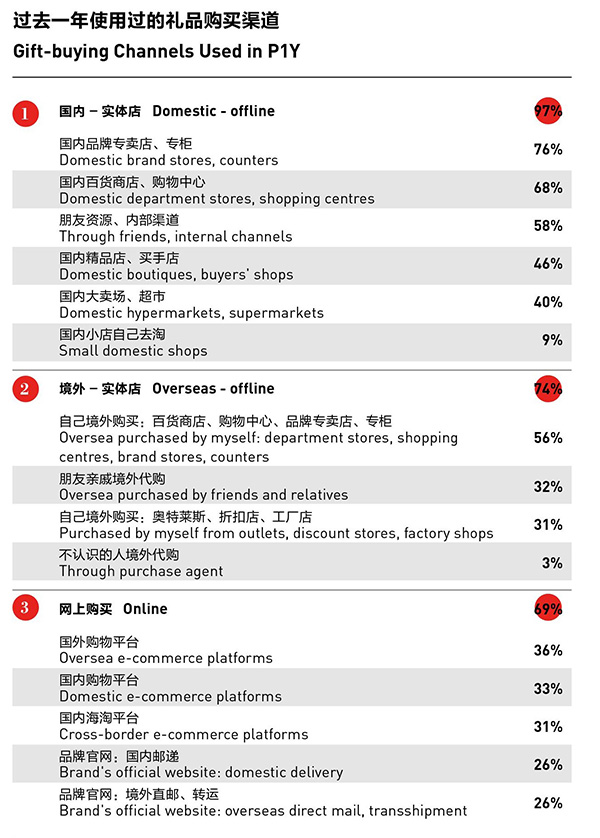 过去一年使用过的礼品购买渠道购买渠道上,97% 的高净值人群有在国内线下实体店购买过礼品。其中,“ 品牌专卖店、专柜”(76%)、“百货商店、购物心”(68%)和“朋友资源”(58%)的使用率高。同时,74% 的人有从境外购买过礼品,其中,超过一半的人有“自己境外购买”的经历。在网上购买过礼品的人数占比为69%。