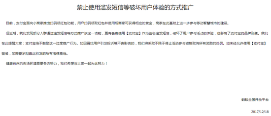 针对这种情况,虎嗅12月25日晚电话采访了支付宝官方的工作人员,对方丢了一个公告,显示12月18日蚂蚁金服开放平台发了一则“禁止使用滥发短信等破坏用户体验的方式推广”的公告——