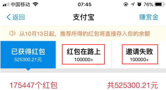 他指的是支付宝近期推出的邀请你瓜分10亿红包活动,结果被羊毛党盯上了,并顺利薅了支付宝的羊毛,在网上流传的截图中,有的支付宝用户在短时间内获取了137.8万元红包,有的获取了52.5万元的红包,同时显示还有10万+个红包在来的路上。