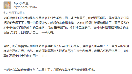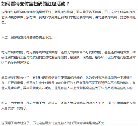 在知乎“如何看待支付宝扫码领红包活动?”这条问题下面,不少网友都分享了身边遇到的一些情况: