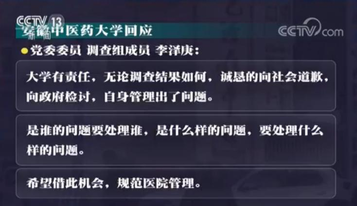 安徽中医药大学党委委员 联合调查组成员 李泽庚:我们又要在管理这一块,要在制度这一块,把它理清楚,到底是哪方面出了问题。对这些问题我们从学校的角度也绝不袒护,是谁的问题就要处理谁,是什么样的问题,要处理什么样的问题。