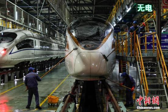 图为工作人员对车头进行人工精洗。 张亨伟 摄
