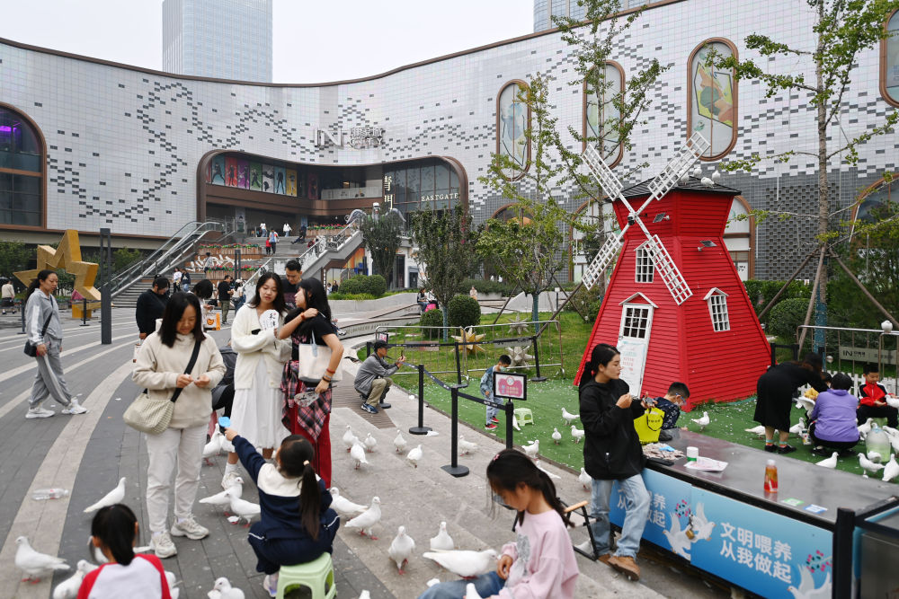 游人在天津金街的广场上喂鸽子(10月13日摄)。新华社记者 李然 摄