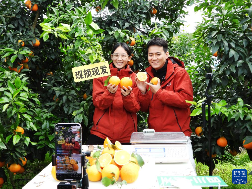 11月18日,在四川省达州市渠县合力镇石燕村柑桔种植基地,工作人员线上直播销售脐橙。