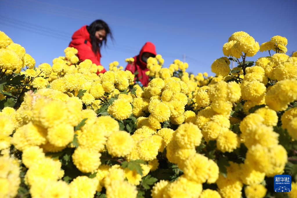 11月18日,河南省焦作市温县黄河街道下石井村一家怀药种植专业合作社员工在采收怀菊花。