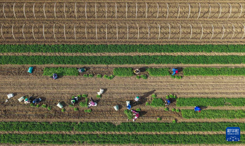 11月18日,河北省唐山市玉田县虹桥镇农民在田间收获香菜(无人机照片)。