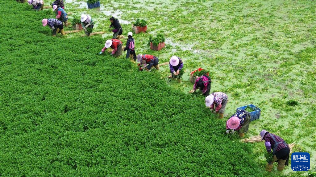 11月19日,广西壮族自治区贺州市平桂区沙田镇道东村农民在采收蔬菜(无人机照片)。