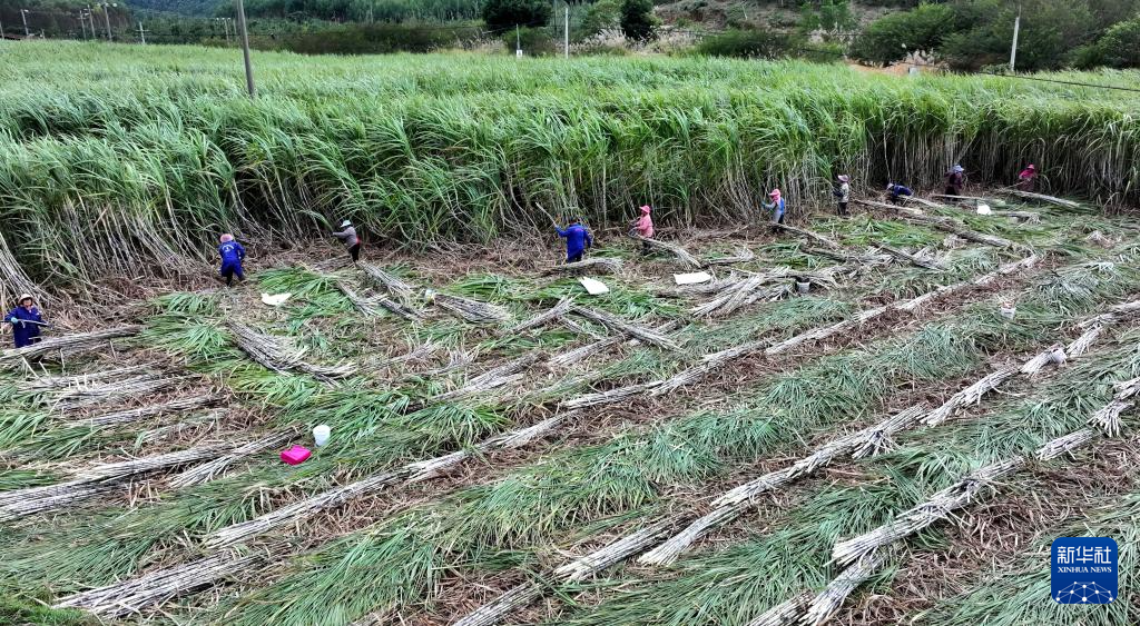 11月18日,在广西壮族自治区柳州市柳城县龙头镇,蔗农在地里砍收甘蔗(无人机照片)。