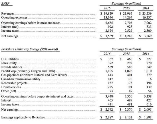 因此,在这份信中,我们将这两家公司进行了单独区分,并将它们合并后的财务报表也从我们的符合美国通用会计准则(GAAP)的资产负债和损益表中剥离出来。去年,这两家主要企业的收入占伯克希尔-哈撒韦公司整个税后收入的33%。