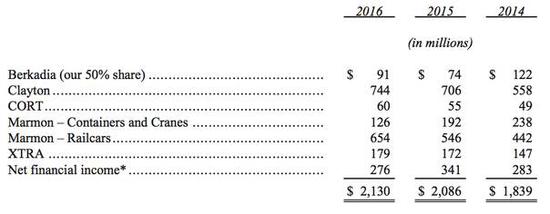 去年,Marmon公司的轨道车租赁业务出现了较大衰退,这将导致2017年公司整体净利润下降。2016年十二月,Marmon公司旗下车队的租用率为91%,低于去年同期租用率97%。我们在2015年从通用电气(28.94, -0.05, -0.17%)公司手中收购的大型汽车的租用率下降尤其严重。同时,Marmon公司旗下的起重机和集装箱的租用率也出现不同程度的下降。