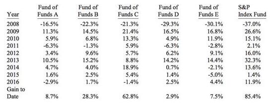 从上图可看出,2008年到现在,五只基金的基金的收益率分别为8.7%,28.3%,62.8%,2.9%和7.5%,而标普指数(2388.3301, 4.14, 0.17%)基金的收益率为85.4%。按我与Protégé Partners的协议,这五只基金的名字没有公开,但我看了他们的年度审计报告。