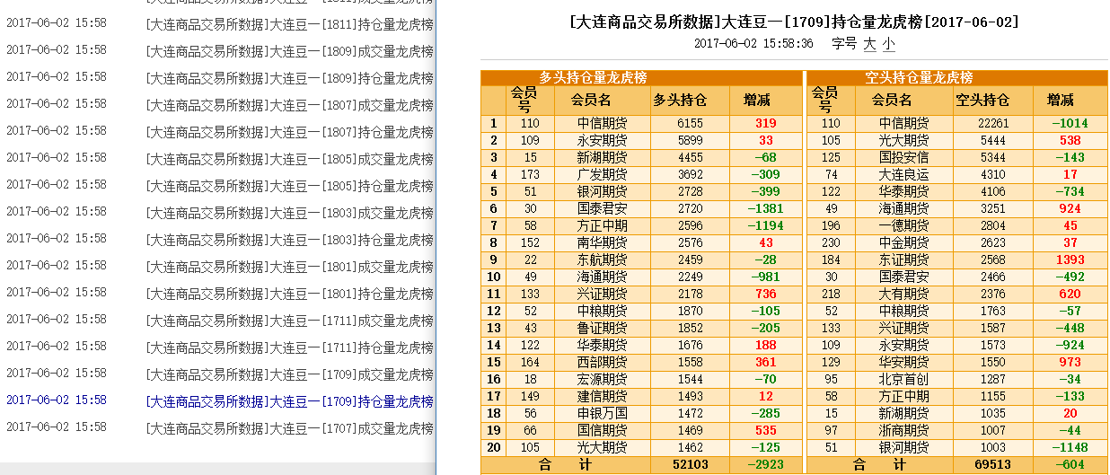 那么你或许会问,安迪有没有可能知道包子妈究竟是做多还是做空?先来说说国内的期货市场这方面情况,首先投资者的交易信息在期货公司层面是严格保密的,但是交易所会在每天结算后公布品种合约多空前20名的会员持仓量,比如大豆品种,大商所每天结算后会公布持仓情况,但是你从中并不能看到具体客户的持仓情况,只能够看到某一会员下所有客户的总持仓量,而且市场中大资金一般会选择分仓,也就是选择几家期货公司布局仓位,为的就是避免信息的不对称。其次,整个市场的体量是非常大的,尤其是越来越多的现货企业参与到期货市场的保值、套利业务当中,即便你知道包子妈是多还是空,但是你无法了解双方的整体实力对比,在具体交易中尤其是很难有绝对的把握让对手盘亏钱,当然安迪是做好了自损八百的决心。那如果包子妈是做的国际市场,而安迪只是看到当初其单据的话,而没有包子妈的期货账户,是很难随时了解包子妈究竟是多还是空。