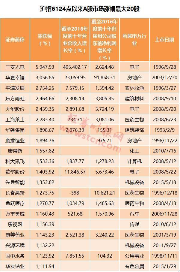 涨幅居于次席的为主板的华夏幸福,该股累计涨幅超过30倍。深市主板涨幅最大的平潭发展,累计涨幅达2754.25%,中小板涨幅最大的东方雨虹,累计涨幅达2464.66%。