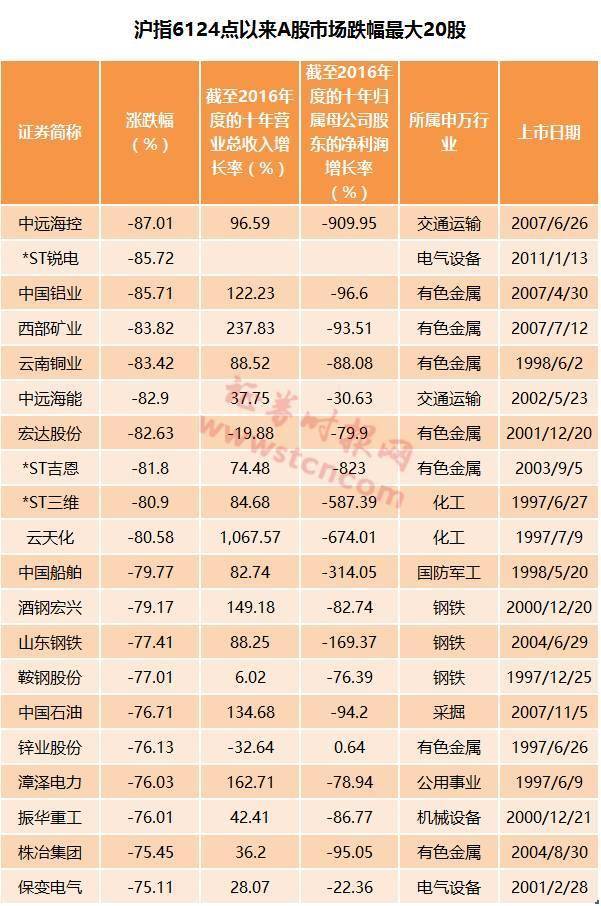 表现最熊的为沪市主板的中远海控,股价实际跌幅高达87.01%,该公司前身为中国远洋。公司2007年6月26日以8.48元的发行价上市,此后短短四个月的时间里,股价一度炒高至68.40元的历史天价,不过在全球金融海啸后,国际航运业进入持续调整周期,公司业绩持续下滑,10年的时间公司营收累计增长不到1倍,期间经历多次年度巨亏,2016年度再次巨亏99亿元。