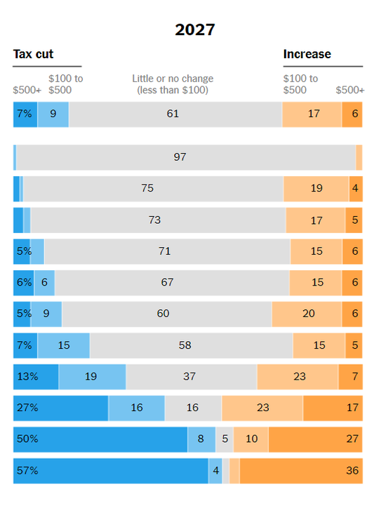 最新的估计显示,几乎每个收入群体中至少有一些人会获得增税,而且这个比例会随着时间的推移而显着增长。