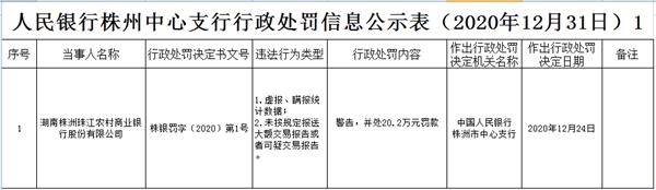 2020年12月24日,中国人民银行株洲市中心支行对株洲珠江农商行警告,并处20.2万元罚款。