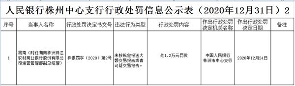 同日,中国人民银行株洲市中心支行对时任株洲珠江农商行运营管理部副总经理易南处1.2万元罚款。