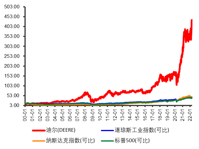 全球农业装备龙头公司——美国约翰迪尔,收入和利润稳健增长,股价从2012年初的50.19美元一路上涨,截至2022年4月14日股价报收于426.75美元,总市值为1340亿美元,十年上涨了7.5倍,年均复合增长率24%,走势远强于同期美国三大股指表现。