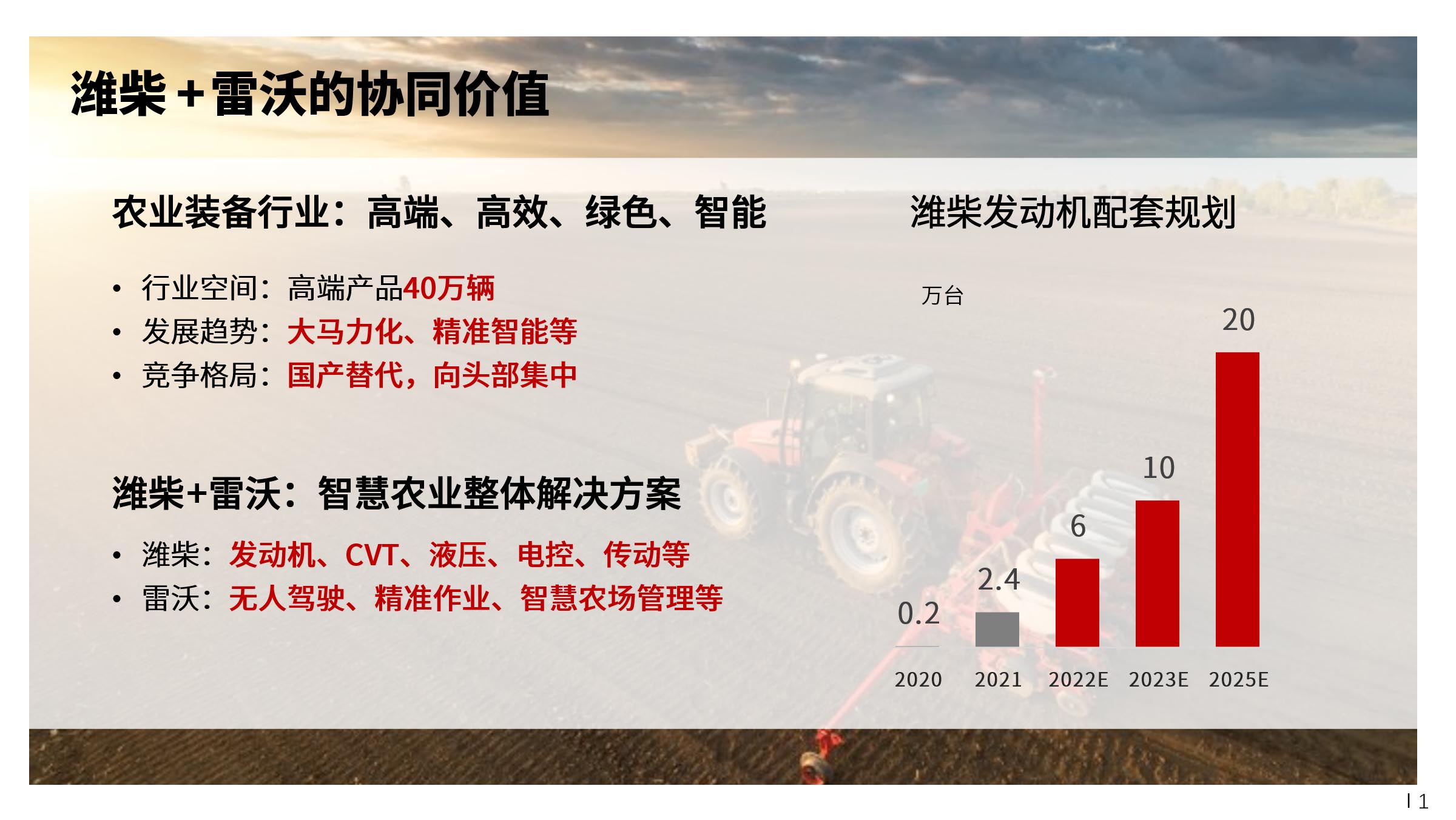 潍柴+雷沃,高端智慧农业整体解决方案,将给中国农业装备行业发展、农民作业效率提升、国家粮食安全以及资本市场带来什么?值得我们一同期待。(CIS)