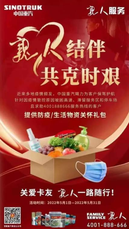 为帮助卡车司机解决出行路上遇到的难题,5月1日,中国重汽正式推出“亲人结伴,共克时艰”服务活动。凡是被困高速、滞留服务区或停车场的用户,中国重汽将为其送去防疫及生活物资关怀礼包,以解卡友燃眉之急。