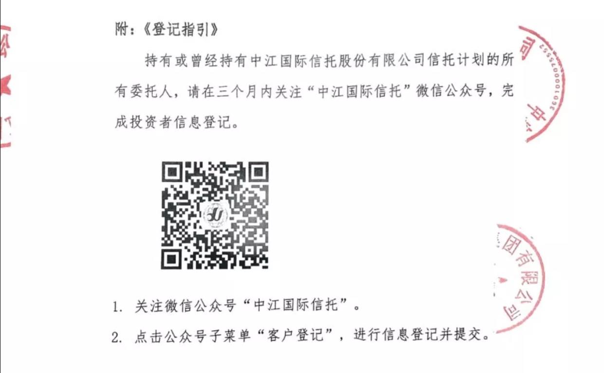 即日起,持有中江信托计划的所有委托人,可于三个月内到中江信托官微统一登记,中江信托将安排专人与已登记的委托人逐一确认、跟进服务。对于已逾期项目,中江信托将在监管部门的指引下负责到底,积极并有针对性地制定“一案一策”措施,妥善、有序地解决历史遗留问题;并每两周在官网上发布跟进情况;对于未到期信托计划,中江信托将每个月在官网上更新动态,进一步夯实风控体系,全力做好委托人服务工作。同时,为答谢所有委托人长久以来对中江信托支持,所有登记的委托人(包括已完成清算的信托计划委托人)都将由中江信托专人跟进,并享受后续专属的定制化服务。