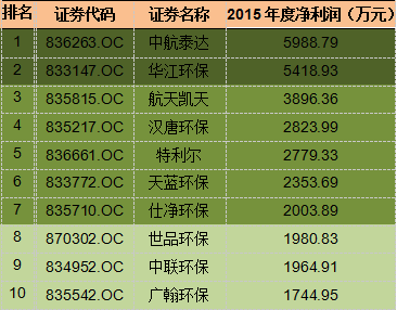 从2015年度净利润指标来看,超过5000万元的企业有2家,2000万元~5000万元的企业有5家,1000万元~2000万元的企业有6家,0~1000万元的企业有14家,净利润为负的企业有5家(泰欣环境暂无相关参考数据)。以排名第一的中航泰达为例,该公司2015年度净利润高达5988.79万元,相对于公司6998万股的总股本,基本每股收益高达1.18元,这个数字足以让众多的上市公司“汗颜”。
