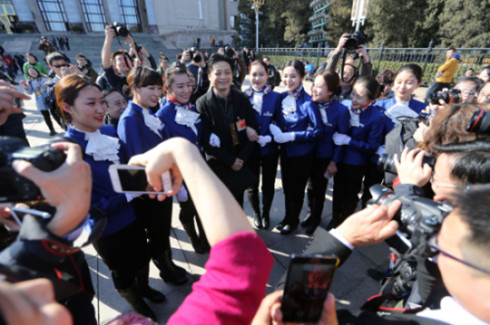 两会服务人员在大会堂前合影,被摄影记者围拍。摄影:本报记者 车亮