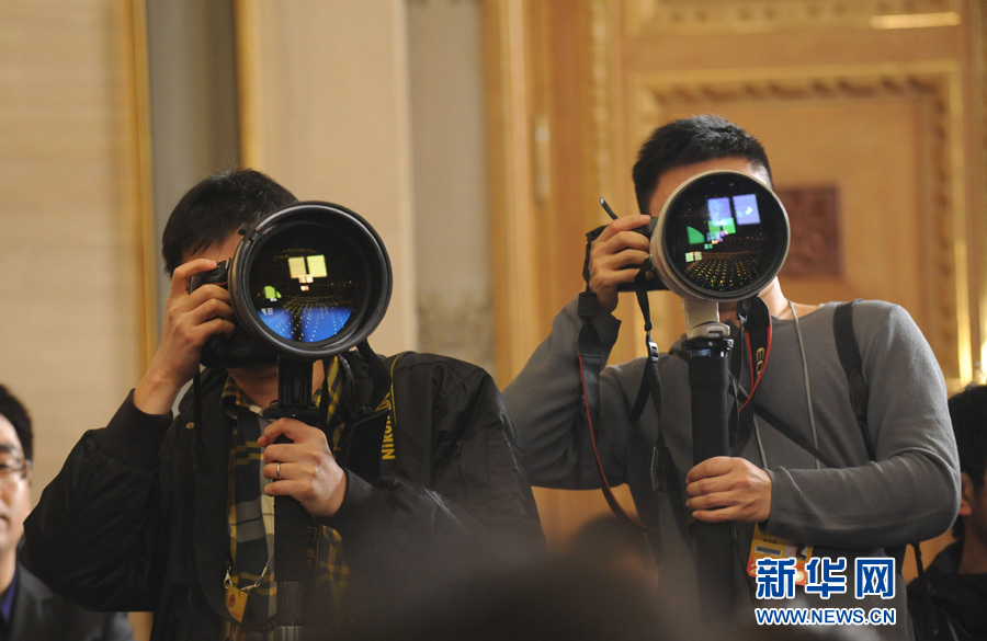3月4日,十二届全国人大四次会议新闻发布会在人民大会堂一层新闻发布厅举行。图为摄影记者在拍照。新华网/中国政府网 陈竞超 摄