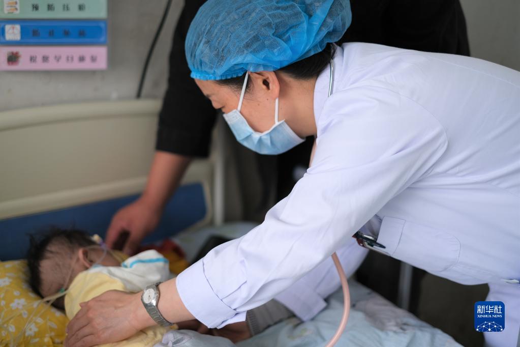 青海省妇女儿童医院医生、青南支医队员孙敬在青海省玉树藏族自治州人民医院给患者检查身体(2022年4月25日摄)。新华社记者 韩方方 摄