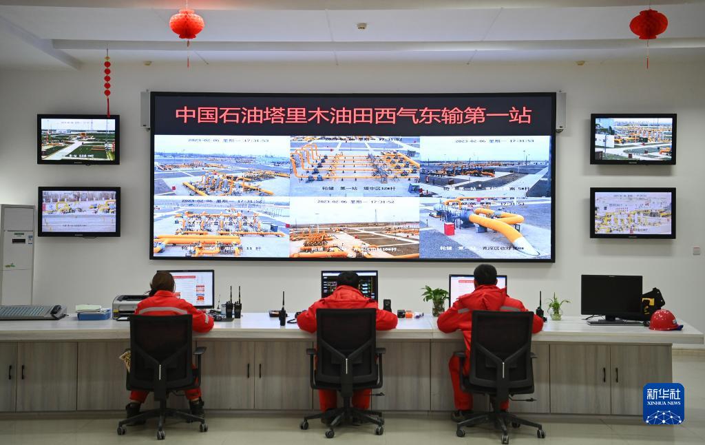 2月6日,工作人员在塔里木油田西气东输第一站站控室内监控管线运行参数。新华社记者 李响 摄