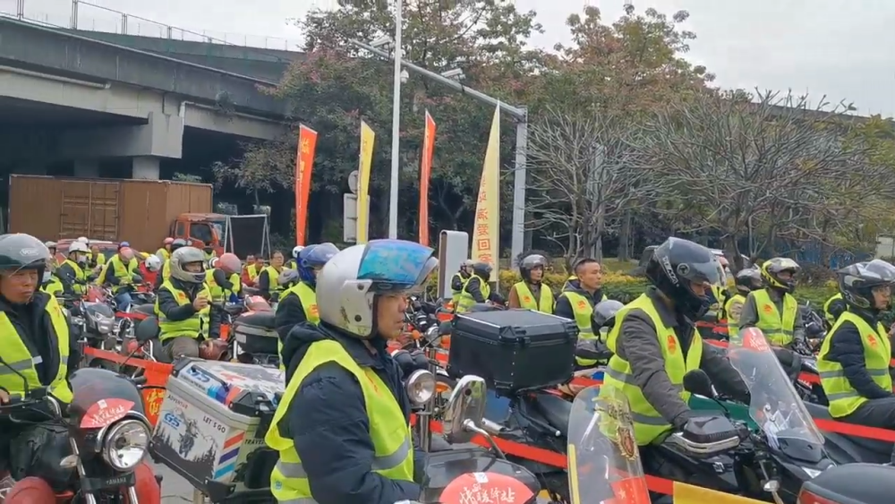 春运首日,在中石化广东佛山龙山加能站,近百名“返乡摩骑”免费加满油,带着装有长途骑行用品的新春福袋开心踏上回家路。
