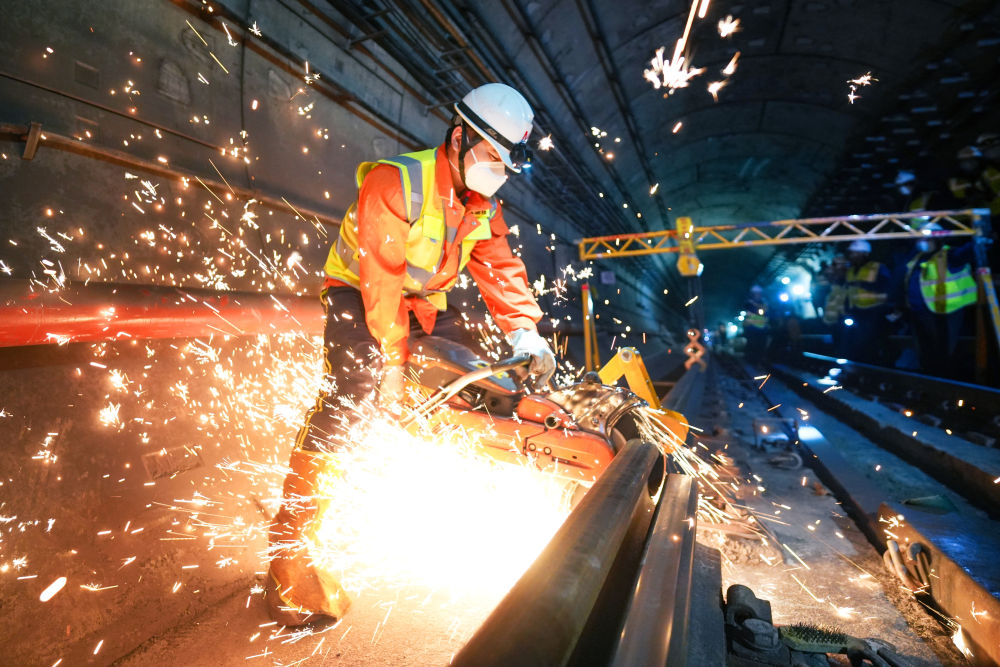 锯轨组施工人员切割旧轨。新华社发(产启斗 摄)