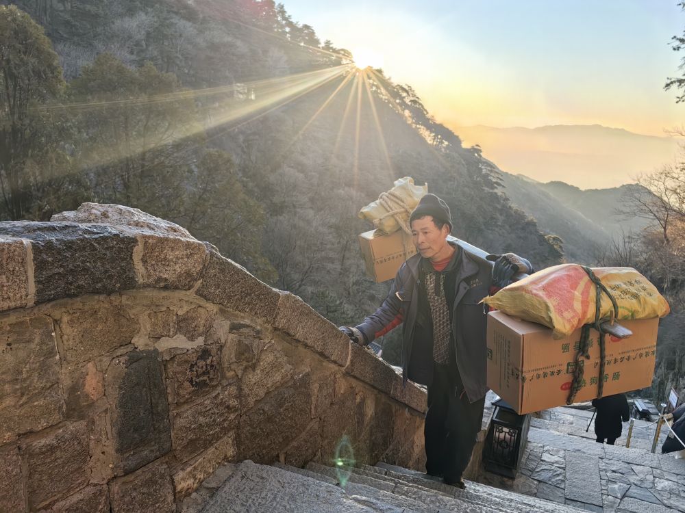 新春走基层·记者体验360行|攀登,歇脚,再出发——新华社记者跟随泰山挑山工送货