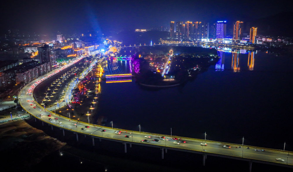 春节期间,夜晚的修水县城车水马龙、路灯与景灯相互交织,烟火气不断升腾。邱剑锋摄